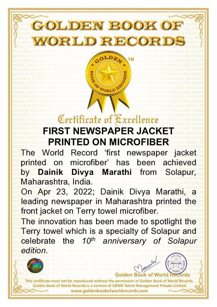 सोलापूर शहराची पूर्वीची ओळख ही ‘गिरणगाव’ अशीच आहे. वस्त्रोद्योग हाच इथला परंपरागत व्यवसाय आहे. हाच धागा पकडून दिव्यमराठी सोलापूर आवृत्तीच्या दशकपूर्तीनिमित्त आवृत्तीचे निवासी संपादक संजीव पिंपरकर आणि युनिट हेड नौशाद शेख यांनी अतिशय आगळा-वेगळा आणि फक्त मराठी वृत्तपत्र क्षेत्रात नव्हे, देशात नव्हे तर जगातल्या वृत्तपत्रसृष्टीतील पहिला अंक वाचकांच्या हाती दिला आहे ज्याचे पहिले पान मायक्रो फायबरने बनविलेल्या टॉवेलवर छापले आहे. असा विक्रमी अंक वाचकांच्या हाती देणारे ‘दिव्यमराठी’ हे पहिले वृत्तपत्र ठरले आहे. याचे आणखीन एक वैशिष्ट्य म्हणजे टॉवेलवरील मुद्रित पानांची ही निर्मिती संपूर्णतः सोलापुरात झाली आहे. मायक्रो फायबर धाग्यांनी विणलेले टॉवेल पूर्वी चीनमधून सोलापुरात येत होते. पण आता त्याची शंभर टक्के निर्मिती सोलापुरातच होते. त्यामुळे अस्सल सोलापुरी नजराणा म्हंटले तर वावगे ठरणार नाही. वाचकांशी आणि दिव्यमराठीवर विश्वास दाखविणाऱ्या जाहिरातदारांची बांधिलकी मानणाऱ्या दैनिक दिव्यमराठी सोलापूर आवृत्तीने आपल्या नाविन्यपूर्ण आविष्काराने जागतिक पातळीवर नवे रेकॉर्ड तयार केले आहे. आजवर खपाचे विक्रमी आकडेवारी मांडून व्यवसायात अग्रक्रमाने राहण्याची स्पर्धा करणाऱ्या वृत्तपत्र क्षेत्रात आता नाविन्यपूर्ण, कल्पक अविष्कारावर वाचकांच्या हृदयात स्थान मिळविणाऱ्या दैनिक दिव्यमराठी सोलापूर आवृत्तीच्या दशकपूर्तीच्या या विशेषांकाचे वाचकांमधून स्वागत होत आहे. यानिमित्ताने मराठी वृत्तपत्रसृष्टी नुसतीच अत्याधुनिक होत नाही तर नावीन्य आणि कल्पक आविष्काराने जागतिक पातळीवर आपले वेगळेपण दाखवीत असल्याचेच सिद्ध होत आहे.