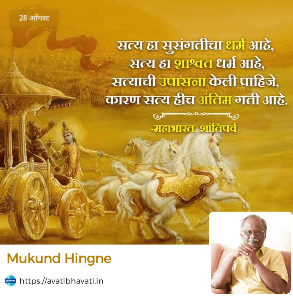 आपल्यावर लहानपणापासूनच आधी आई-वडील मग गुरुजन, मार्गदर्शक, हितसंबंधी नेहमी सत्याची बाजू धरण्याचे संस्कार करतात. या संस्कारातूनच आयुष्यात यशस्वी होण्यासाठी आपण जग बदलण्याची भाषा करू लागतो. जगाने आपल्या सारखाच विचार केला पाहिजे त्यासाठी त्यांची विचारधारा बदलण्याची धडपड आपण सुरू करतो. पण जगाला बदलण्यात आपली शक्ती वाया घालवण्यापेक्षा आपल्यात बदल करण्याची प्रक्रिया आपण कधीच करत नाही. कारण आपण सत्याचा पेहराव घालून आलेल्या असत्यालाच आपला सोबती बनवलेले असते. त्याच्या भ्रमित जगात आपण पुरते भ्रमिष्ट झालेलो असतो. आपल्याला मनुष्य जन्म मिळाल्याचा अहंभाव असतो. त्यातच हा जन्म सार्थकी लागायचा असेल तर आपण जे काम करतोय त्यात उत्तुंग असे ‘यश’ मिळायला हवे हा हव्यास आपल्याला असत्याच्या मोहपाशात पार गुरफटून टाकत असतो. आपण असत्याच्या या मोहपाशात अडकलेले असतानाच कोणत्या तरी एका क्षणी ‘सत्य’ आपल्या समोर येवून उभे रहात असते. पण आपण त्याला स्वीकारत नाही, कारण सत्य हे नेहमी ‘नागडे’ असते…!