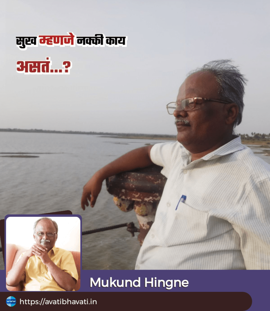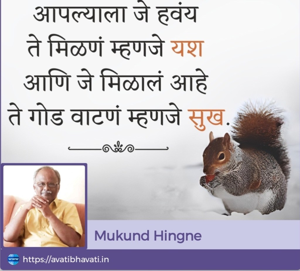 शेवटी काय ? तर यश मिळविण्याचे प्रयत्न आणि त्यातून मिळणारे सुख यासाठी एक निरंतर वाढत जाणारी आंतरिक ऊर्जा हवी अन ही ऊर्जा तयार होते ती एकाग्रतेतून….मनःशांती मधून. इंद्रियांना एका विशिष्ट बिंदूंवर आणून स्थितप्रज्ञ करायचं…मग शरीरात तयार होणाऱ्या निरव पोकळीत घुमतो तो फक्त तुमच्या ईप्सित ध्येयाचा हुंकार….हा हुंकारच तुम्हाला तुमच्या यशाकडे घेऊन जातो. ही एकाग्रता….हा हुंकार तुम्हाला अगदी काही क्षण का होईना ऐकायला मिळतो… त्यासाठी कुणी नदीत उठणाऱ्या पाण्याच्या तरंगाकडे एकटक पहात राहतो, कुणी समुद्राच्या लाटांच्या गाजामध्ये तो हुंकार शोधतो, कुणी मंदिराच्या गर्भगृहात, कुणी प्रार्थनास्थळात, कुणी चर्चच्या घंटानादात , कुणी सरोवर, जलाशय, तलावात उठणाऱ्या हलक्याशा तरंगातून हा सुखाचा हुंकार अनुभवत असतो. मग मला सांगा, तुम्हाला काय वाटतं..? सुख म्हणजे नक्की काय असतं. श्रीरंग गोडबोलेंच्या गीता सारखं आणि गायक-अभिनेता प्रशांत दामलेंच्या गळ्यातून निघणाऱ्या अवीट स्वरांसारखं…काय पुण्य असतं की ते घरबसल्या मिळतं… मला सांगा…!