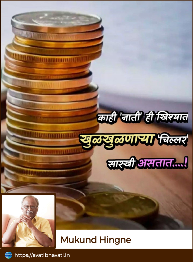 ‘नाते’ टिकविण्याची जबाबदारी ही फक्त तुमच्या एकट्याची जबाबदारी नसते. दोघांनी एकमेकाला ‘आनंद’ मिळवून देण्यासाठीच ‘नाते’ जोडलेलं असतं. त्यामुळे ते टिकविण्याची जबाबदारी दोघांची असते. स्वभाव गुणदोषामुळे जर हे नाते फारकाळ टिकणार नसेल ! तर अशा ‘बंधपाशातून’ मुक्त झालेलं केंव्हाही चांगलेच असते. उगीचच स्वाभिमान आणि स्वतःच्या आयुष्याची फरफट करण्यापेक्षा ‘त्या’ नात्याचा एकदाचा ‘सोक्षमोक्ष’ लावलेला चांगला. प्रत्येकाच्या आयुष्यात असं चुकलेलं आणि आयुष्याला चुकविणारं एखादं तरी ‘नातं’ निर्माण झालेलं असतंच. अशा नात्याला जपण्यासाठी इतर चांगल्या नात्यांना दुखावू नकात. कारण काही ‘नाती’ ही खिश्यात खुळखुळणाऱ्या ‘चिल्लर’सारखी असतात. ओझं खूप झालं की खिशाला भोक पाडून घरंगळत पडतात. तुमच्याच जवळ राहण्याचा त्यांचा उद्देश नसतो. तेंव्हा ‘कसे आहात ?’ असा प्रश्न विचारणारा हा खिशातल्या ‘चिल्लर’ नाण्यासारखा आहे का..? हे मात्र तपासून अवश्य पहा.
