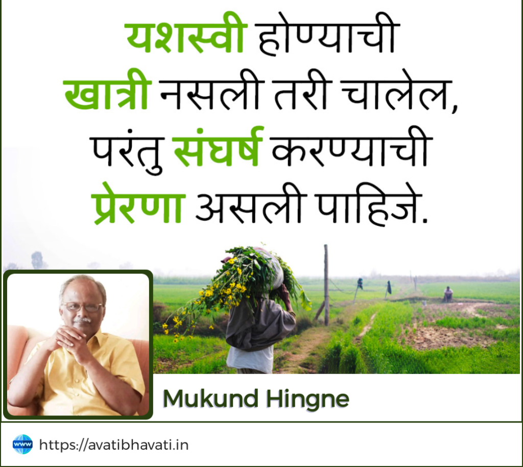 मुंग्या कशा कुणाचेही मार्गदर्शन नसताना एका रांगेत आपले ‘खाद्य’ शोधायला मार्गस्थ होत असतात. अगदी तसंच नोकरदार मंडळी, कष्टकरी माणूस रोज मुकाटपणे आपला रोजगार शोधायला घरातून बाहेर पडतो. मुंग्यांना आपण ‘आदर्श’ समजतो. त्यांचं एका रांगेत, एकाच गतीने चालण्याला आपण स्वयंशिस्तीचे उदाहरण समजतो. जसं काही मुंग्यांची भाषा, त्यांचं मन आपल्याला समजते. सगळा भंपकपणा…. दुसरं काय ? एकतर मुंग्या रोजगाराच्या शोधार्थ (त्यांच्या दृष्टीने खाद्याच्या शोधार्थ) बाहेर पडतात, हीच समजूत बाळबोध वाटते. सतत चालत राहणे हीच त्यांची प्रकृती आहे. आत्ता मुंग्या आरामखुर्चीत ‘आराम’ करत आहेत किंवा दुपारच्या जेवणानंतर सदाशिव पेठेतील मुंग्या ‘वामकुक्षी’ घेतात असं कधी ऐकलं आहे का ? सतत चालत राहणे हाच त्यांचा जीवनक्रम आहे. त्यामुळे मुंगीचा ‘आदर्श’ डोळ्यासमोर ठेवून ‘प्रयत्नवाद’ सांगणे म्हणजे कोणतेही ध्येय समोर न ठेवता निव्वळ प्रयत्नवादी राहण्याचा सल्ला देण्यासारखेच आहे. समोर उद्दीष्ठ असेल तर ते साध्य करण्यासाठी नक्कीच संघर्ष केला पाहिजे. त्यात यश मिळेल किंवा अपयश ! त्याची पर्वा न करता संघर्ष हा केलाच पाहिजे. म्हणून सगळ्यात पहिले स्वप्न असे पाहिले पाहिजे जे आयुष्याचे उद्दीष्ठ होईल. मग त्या स्वप्नांचा पाठलाग करण्यासाठीचा संघर्ष हा तुम्हाला यश म्हणजेच समाधानाची फलप्राप्ती नक्कीच देईल. चाकोरी बाहेर जगण्याची स्वप्ने पाहणाराच ‘विकसित’ देशाचा नागरिक समजल्या जातो. इथे रोजच्या जगण्यातील अडथळे पार करण्यात आयुष्य खर्ची पडते. आत्ताशी कुठं आपण चांद्रमोहिम फत्ते केली आहे. संपूर्ण जगाचं लक्ष आपल्याकडे लागलेलं आहे. भारतीयांच्या संस्कृतीचे अनुकरण करण्याची पाश्चात्यांची ‘फॅशन’ बनू लागली आहे. अशा टप्प्यावर भारतीयांची ‘यश’ म्हणजे मोबदला हे समीकरण सुरू आहे. मग चंद्रावर पोहचून आपण मोबदला काय मिळवला ? स्वप्ने बदलण्याचे उद्दीष्ठ ठेवले तर हे शक्य आहे.