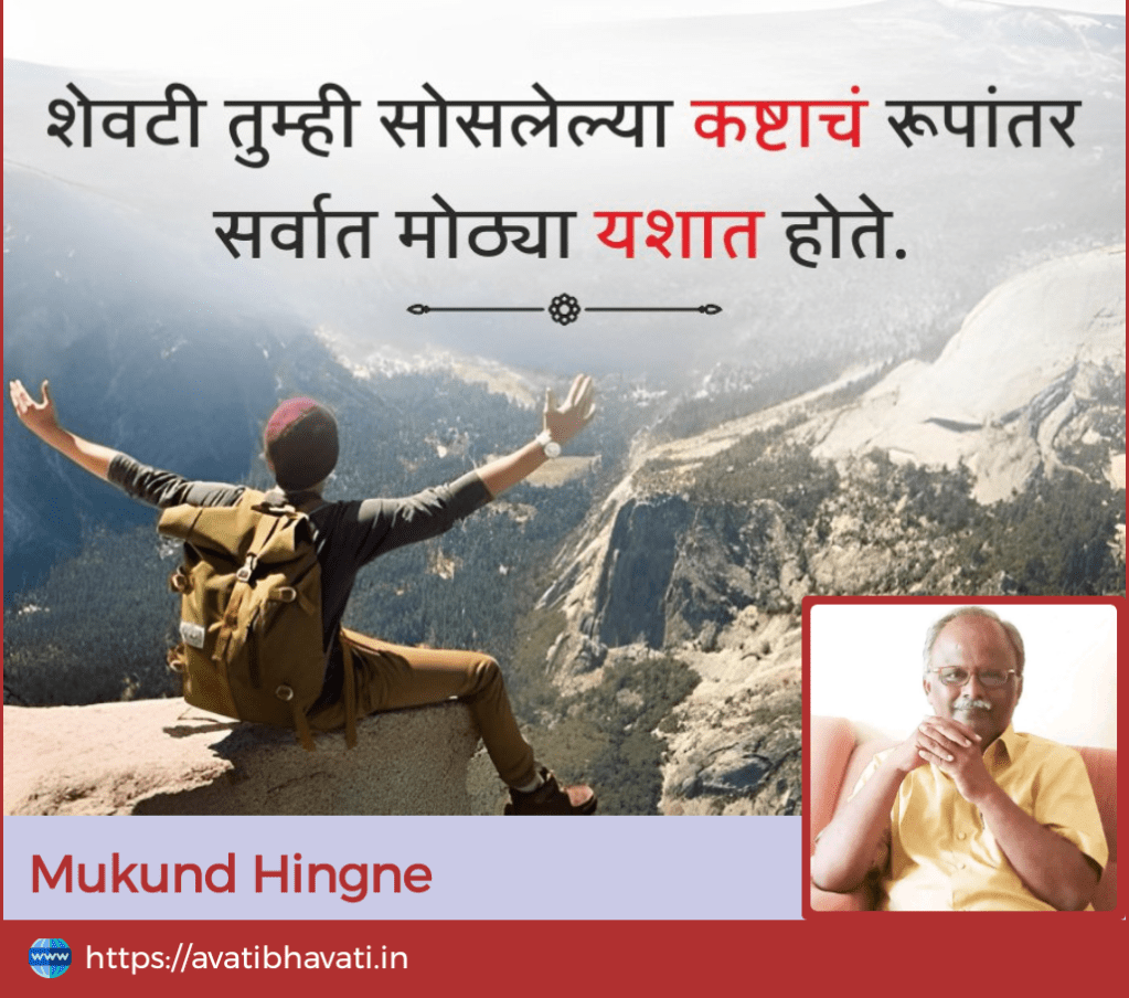 आपण रोजच्या कामातून नेमकं काय शोधतो ? यश….मोबदला की समाधान ? कारण रोजच्या, अगदी दिनचर्येतील व्यस्ततेच्या गर्दीतूनही आपण समोर येणारे काम अगदी यांत्रिकी पद्धतीने पूर्ण करीत असलो तरी दिवसाच्या शेवटी म्हणजे रात्री अंथरुणावर पडल्यावर दिवसभराच्या कामाचा ताण, थकवा बाजूला सारताना एक विचार मनात नक्कीच येतो…..आज आपण कमावलं काय ? आपल्याला यापेक्षा नक्कीच मोठं यश हवंय, मग यश म्हणजे नक्की काय ?