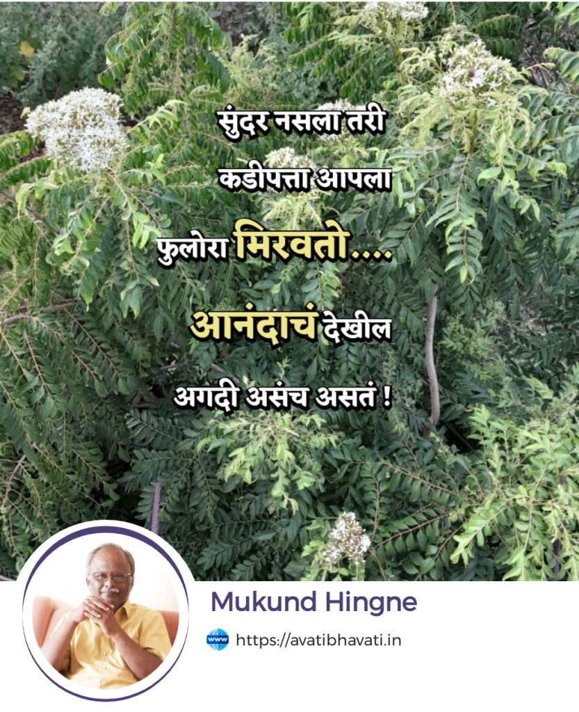 लहानपणी आपले नाक धारदार का नाही ? यावरून मी खूप दुःखी रहायचो. माझ्या वर्गातले सर्व धारदार नाकाची मुले मला चिडवायची. कित्येकदा शाळा सुटल्यावर रडत-रडत मी एकटाच घरी यायचो. माझी आई मात्र माझीच समजूत घालायची. ‘कोण काय बोलतं याकडे आपण फारसं लक्ष द्यायचं नसतं, हाथी चले बाजार…कुत्ते भोंके हजार’ असं ती कायम मला सांगायची. तिची तटस्थ वृत्ती आणि सोशिकता अंगी अगदी वारसा पद्धतीने आल्याने ती गेल्यानंतर आता मला त्याचा खूप फायदा देखील होतो. सामान्य जीवन जगताना खरंच तुमच्या सुंदर असण्याचा काहीच फायदा होत नसतो. जॉब मिळवताना तुम्ही सुंदर, उठावदार आहात म्हणून तुमचं ‘सिलेक्शन’ होवू शकते. पण जॉब टिकवण्यासाठी जो कामातला स्मार्टनेस लागतो, तो जर तुमच्याकडे नसेल तर तुम्ही नुसतेच सुंदर असण्याचा काहीही फायदा होत नाही. हे मी अनुभवले देखील आहे. सोशिकतेचं म्हणाल तर आता निवृत्तीकडे झुकणाऱ्या वयापर्यंत खासगी क्षेत्रात केलेली नोकरी हा माझ्या सोशिकतेचा परमोच्च बिंदू असल्याचे मी समजतो. अगदी कडीपत्ताच्या फुलोऱ्या सारखं माझं सौंदर्य आहे. कडीपत्याचा फुलोरा आकर्षक आणि सुगंधी मुळीच नसतो…कडीपत्ताची पाने स्वयंपाकात उपयोगी असली तरी त्याचा फुलोरा आणि बियांचा असा कोणता उपयोग होतो याबद्दल फारशी शास्त्रोक्त माहिती नाही. पण निसर्गाची कृपा म्हणून कदाचित त्याचं देखील काही काळाचं अस्तित्व असावं. शेवटी प्रत्येकाच्या सुंदरतेच्या कल्पना आणि उपयोगीत्व वेगवेगळे आहे. आपल्याला होणारा ‘आनंद’ हा इतरांना होणाऱ्या आनंदापेक्षा कदाचित महत्वाचा नसेलही पण इतरांच्या जगण्याशी आपण त्याचा संबंध का जोडायचा…?