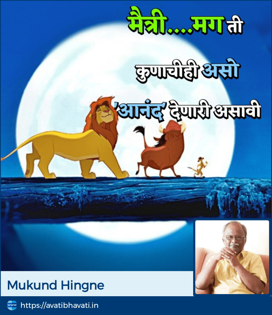 आपल्या आयुष्याचे किंवा आपल्या जगण्याचे सरळ-सरळ दोन विभाग करून टाकावेत. म्हणजे आपलं जगणं मापायला सोपं जातं. एक विभाग म्हणजे आपलं घरातलं जगणं आणि दुसरं म्हणजे आपलं घराबाहेरचं जगणं. घरात जसं आनंदी आणि एकोप्याचे वातावरण आपल्याला हवं असतं अगदी तसंच वातावरण आपल्याला घराबाहेरच्या दुसऱ्या विभागात मिळालं तर आपण स्वतःला कायम आनंदी ठेवणारे भाग्यवान समजायला काहीच हरकत नाही. घरात जशी आपल्याला सकारात्मक ऊर्जा कायम असावी असं वाटतं अगदी असंच वातावरण आपल्याला घराबाहेरच्या जगात हवं असतं. घरात आपल्याला तळहातावर झेलणारी आपली माणसं आपल्या ‘अवतीभवती’ असतात. त्यांच्यादृष्टीने आपण घरातील कर्ता असतो. आपल्यावर अवलंबित्व असल्याने कदाचित ते अधिक ममत्वाने काळजी घेत असतात. पण घराबाहेरच्या जगात असं वातावरण मिळणं अगदीच मुश्किल असतं. बाहेरच्या जगात एकच नातं तुमची काळजी घेणारं असतं ते म्हणजे मैत्रीचं नातं. त्यामुळे तुमची असलेली मैत्री हीच घराबाहेरच्या जगात तुमची ‘ताकद’ बनलेली असते. तुम्ही कुणाशी मैत्री करावी हे सर्वस्वी तुमच्यावर अवलंबून असते. वेव्हलेंथ जुळली, ट्युनिंग जमलं की मैत्री आपोआप होते. त्यासाठी त्याची जातपात, धर्म, वर्ण, कुळ, गोत्र, शाकाहारी की मांसाहारी कशाचाही संबंध गरजेचा नसतो. फक्त मैत्रीही पवित्र आणि आनंददायी असावी अशी दोघांचीही उत्कट भावना असावी लागते. म्हणूनच आयुष्यभरात हजारो लोकांच्या सानिध्यात आपण कोणत्या न कोणत्या कारणाने येत असलो तरी जिवलग म्हणून चार मित्रांच्यावर आपली कधीच मजल जात नसते. मोबाईलच्या फोनबुकमध्ये सेव्ह असलेले हजारो जण थोडीच आपले मित्र असतात…!