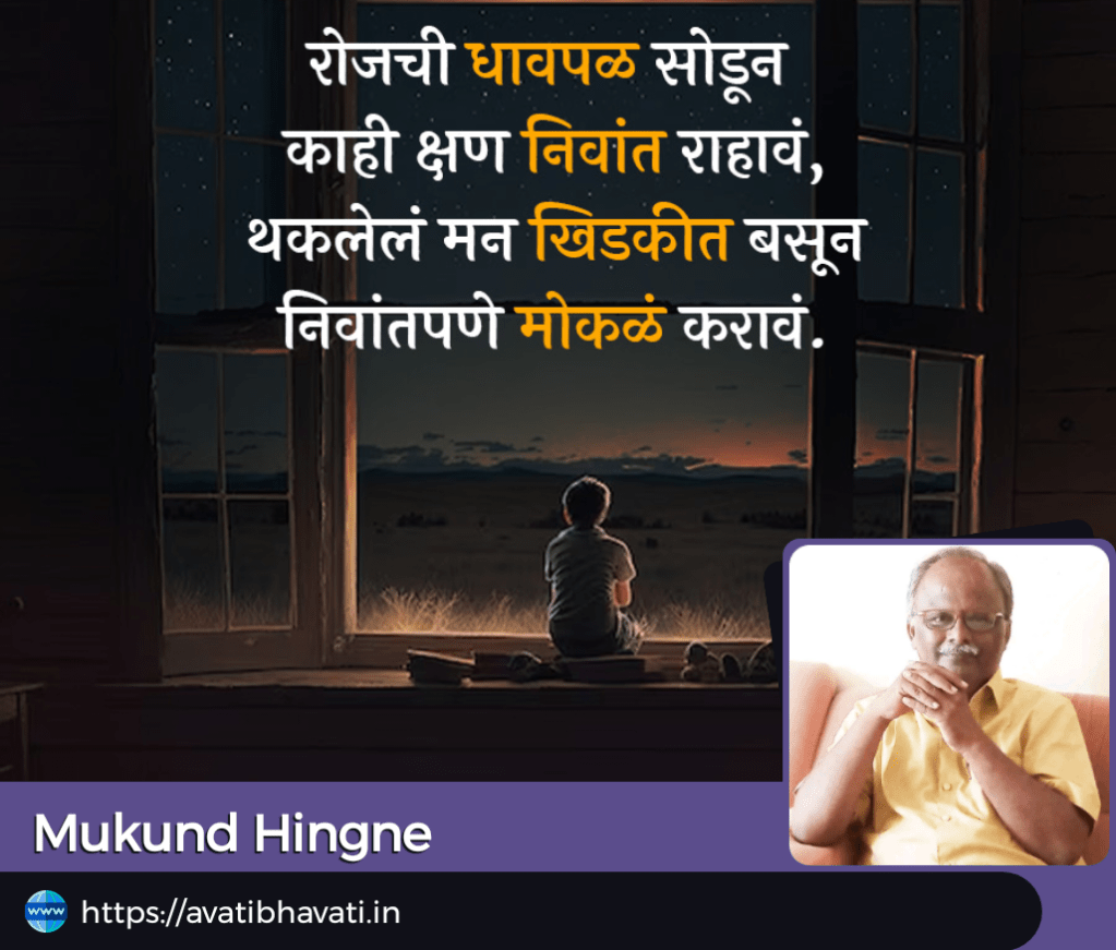 मुळातच समोर किती बलाढ्य संकट उभे राहिले आहे यावर आपला विजय किंवा पराजय अवलंबून नसतो. समोर बलाढ्य शक्ती जरी उभी ठाकली तरी तुम्ही तिचा सामना करून तिला पराभूत करू शकता मात्र त्यासाठी कणखर मनाची आवश्यकता असते. हे कणखर मन कुठल्या देवळात किंवा बाजारातील कुठल्याही मेडिकल स्टोअरमध्ये मिळत नाही. मन तर तुमच्या जवळच असते, फक्त त्याला कणखर बनवायचे असते. त्यासाठी कुठलीही मेडिकल थेरपी नाही तर एकाग्रता हीच मनाला कणखर बनवू शकते. याकरिता रोज सांजवेळी अंधारून येत असताना काही वेळ अगोदर स्वतःला एकाग्र अवस्थेत घेवून जा. यासाठी अगदी सहज आणि सोपा उपाय करता येवू शकतो. सांजवेळी घरातल्या खिडकीपाशी जावून बसा. सकाळची लगबग, धावपळ सगळी शिथिल झालेली जाणवेल. रस्त्यावरून घराकडे परतणारी गर्दी जरी वेगात असली तरी ती फक्त घरी जाण्याची ओढ मनात घेतलेली असते. त्यामुळे तिच्या वेगात तणाव नसतो. हीच मनातून शांत होण्याची एक चांगली वेळ आहे. बसताना फक्त अवयवांना शिथिल करू नकात तर सर्व इंद्रियांना देखील विचारमुक्त करा. मग बघा अपेक्षित परिणाम नक्की मिळेल. रात्रीचे जेवण घेतल्यावर नक्की तुम्हाला तणावमुक्त झोप लागेल. शेवटी आपल्या आयुष्यात तणाव निर्माण व्हायला आपणच कारणीभूत असतो. त्यामुळे तणावमुक्त होण्याचे उत्तर देखील आपल्याकडेच असते.