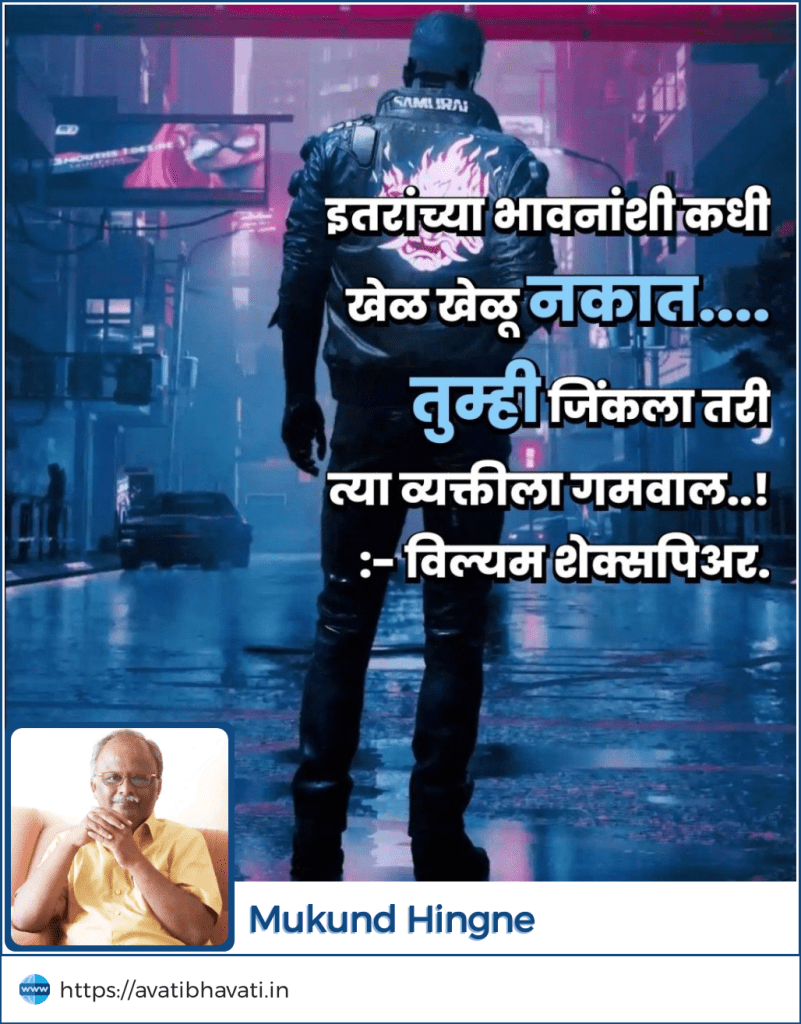 जगप्रसिद्ध नाटककार विल्यम शेक्सपिअर म्हणतो की, तुम्ही इतरांच्या भावनांशी कधी ही खेळू नका, कारण तुम्ही खेळ जिंकू शकाल पण धोका असा आहे की तुम्ही त्या व्यक्तीला आयुष्यभरासाठी गमवाल. भावभावनांच्या कल्लोळात स्वार्थ आणि संघर्षातून निर्माण होणारी शोकांतिका पंधराव्या-सोळाव्या शतकात शेक्सपिअरच्या साहित्य लेखनातून अत्यंत प्रभावीपणे आली. याचा अर्थ भारतात किंवा इतर देशात त्याच्या इतके प्रभावी लेखन कुणी केले नाही का ? हा ‘वाद’ इथे अपेक्षित नाही. आजकाल कुठल्याही विषयाचा उलगडा करताना त्यात गोंधळ उडवून देण्याकडे अधिक कल असतो. तर शेक्सपिअरने मांडलेले वरील ‘मत’ हे कालातीत आहे. चारशे-साडेचारशे वर्षानंतरही त्याचे हे मत आपल्याला प्रत्ययाला येते. म्हणूनच विषयाची सुरुवात करताना आंग्ल भाषीय नाटककार शेक्सपिअरच्या ‘कोट्स’चा संदर्भ घेतलाय.