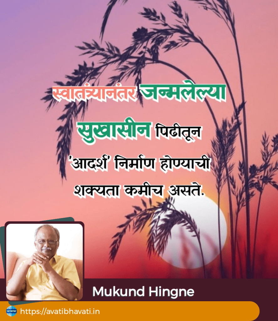 सध्या सोशल मीडियावर व्यक्त केली जाणारी भाषा, सभ्यता आणि ज्ञान लालसेचे अगदीच मृत पातळीवर घसरलेले प्रमाण पाहता आमच्या पिढीतुन म्हणजेच साठीकडे झुकलेल्या पिढीमधून समाजाला सुसंस्कारित मार्गावरून नेणारा ‘आदर्शवाद’ जोपासला गेला नाही. हे स्पष्टच आहे आणि याची खंत देखील माझ्या पिढीला मरेपर्यंत राहील.(अर्थात ते भौतिक सुखाच्या स्वप्नरंजनामधून बाहेर पडणार असतील तर) १९६५ नंतर जन्मलेली पिढी ही खऱ्या अर्थाने सुखासीन काळात जन्मलेली पिढी म्हणून ओळखल्या जाते. आमच्या अगोदरच्या पिढ्या ह्या पारतंत्र्यात जन्माला आल्या होत्या. हे त्यांचे दुर्दैव असले तरीदेखील स्वातंत्र्यासाठी प्राण अर्पण करणारा राष्ट्रवाद त्यांच्या धमन्यांमधून सळसळत होता. संस्कृती, सभ्यता, राष्ट्रभक्ती, सन्मानजनक वागणूक याची भूक त्या पिढ्यांना होती, कारण स्वातंत्र्य मिळविण्यासाठी त्यांचा जन्म झाल्याचा ‘आदर्शवाद’ त्यांच्यामध्ये जोपासला गेला होता. समाजाला दिशा देणारे आदर्शवादी महापुरुष असेच जन्माला येत नसतात. निसर्गाची प्रतिकुलता आणि मानवाची असहायता जेंव्हा अस्तित्व नष्ट होण्याच्या धोक्याच्या रेषेजवळ जाते तेंव्हाच आदर्शवादी जन्माला येतो. साठच्या दशकात आणि त्यानंतरच्या काळात जन्मलेल्या पिढ्या ह्या सुख लोलुप का झाल्या ? हा प्रश्न मात्र आता सगळ्यांना सतावणार आहे.