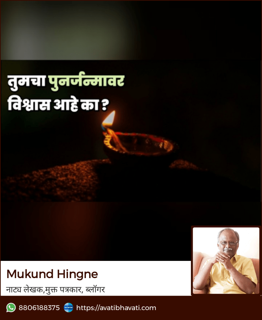देवभोळ्या माणसाला किंवा धार्मिकवृत्तीच्या माणसाला जर विचारले की तुमचा पुनर्जन्मावर विश्वास आहे का ? तर तो हो म्हणेल. पण हेच तुम्ही नास्तिक माणसाला किंवा धर्माची चिकित्सा करणाऱ्या माणसाला विचाराल तर तो, पुनर्जन्म म्हणजे निव्वळ थोतांड आहे असंच म्हणेल. बरं, मनुष्यजन्म हा एकदाच मिळतो याबद्दल देखील अनेकांची अनेक मते आहेत. त्यामुळे आत्ता जिवंत आहे तोपर्यंत मनमुराद जगावे असा ऐहिक वाद सांगणारे जसे विद्वान भेटतात तसेच पुढचा जन्म पुन्हा मनुष्ययोनीतुन मिळावा म्हणून परोपकार आणि पुण्यशील कार्य करण्याचे तत्व मांडणारे धर्मपंडित देखील भेटतात.