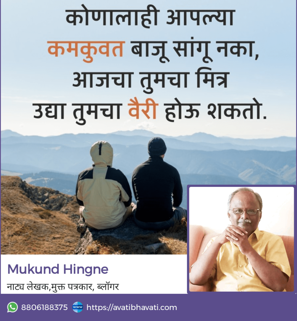 आयुष्यात मैत्री ही केलीच पाहिजे किंबहुना ती असावीच. पण मैत्री करण्यासाठी योग्य माणसाची किंवा सहकाऱ्याची निवड करणे हे सर्वस्वी आपल्यावरच अवलंबून असते. खरं म्हणजे आपल्यावर आलेल्या अडचणीच्या काळात ही गोष्ट आपल्याला प्रकर्षाने जाणवते. याच काळात आपला मित्र कोण ? आणि शत्रू कोण याचा आपल्याला दृष्टांत मिळत असतो. आपणच मित्र म्हणून जवळ केलेला व्यक्ती आपल्या अडचणीचे भांडवल करून आपली यथेच्छ बदनामी करताना दिसले की आपण हताश होतो. पण आपल्या वाट्याला येणाऱ्या या कटू अनुभवाला आपणच जबाबदार असतो. आपण मित्राची निवड करायला चुकलो याची पहिल्यांदाच आपल्याला जाणीव होते. पण आपण त्याला साधा जाब सुद्धा विचारू शकत नाही. कारण मित्र म्हणून आपण त्याच्याशी गट्टी करताना आपली अनेक गुपिते आणि आपली कमकुवत बाजू त्याच्यासमोर जाहीर करून बसलेलो असतो. बस्स….तुमच्या अडचणीच्या काळात तो याच कमकुवत बाजू जगजाहीर करत तुमचा प्रभाव कमी करण्याचा प्रयत्न करत असतो. त्यावेळी तुम्ही काहीच करू शकत नसता. मैत्रीची आपली निवड चुकली याचे दूषण स्वतःलाच देत असहायता दाखविण्याशिवाय तुमच्या हाती काहीच शिल्लक नसते. मग मैत्री करावी तर कुणाशी ? हा प्रश्न तुमच्यासमोर उरतो. खरं म्हणजे आपल्या प्रश्नांची उत्तरे आपल्या जवळच असतात. आपण नेहमी आपल्या बरोबरीच्या व्यक्तीशी मैत्री करावी हाच संस्कार आपल्याला केलेला असतो. या संस्कारात पण तसं पाहिलं तर स्वार्थीपणा लपलेला असतो. आपल्या प्रगतीमध्ये पूरक ठरतील अश्याच व्यक्तींच्या घोळक्यात आपण रहायचे हा मतलबीपणा त्यामागे असतो. मात्र बरोबरी साधणाऱ्या दोन व्यक्तींमध्ये स्पर्धा असते हेच आपण विसरून जातो. याउलट आपल्यापेक्षा कमी बुद्धीचा किंवा स्तरावरचा मित्र असेल तर तो नक्कीच आपल्याशी कधी ईर्षा किंवा स्पर्धा करणार नाही. प्रत्येक गोष्टीत किंवा कामात त्याच्या होणाऱ्या चुका आपण चेष्टेचा विषय बनवत असलो तरी तो मात्र तुमच्याशी प्रामाणिक राहण्याचा प्रयत्न करत असतो. कारण त्याला त्याच्या आकलन शक्तीच्या कमकुवतपणा बद्दल माहिती असते. अश्यावेळी तो तुमच्याकडून मिळणाऱ्या सहाय्याची अपेक्षा करत असतो. तुमच्या अडचणीच्या काळातदेखील तोच तुमच्याशी प्रामाणिक रहात असतो. कारण या अडचणींतून देखील तुम्ही सुखरूप बाहेर पडाल याची त्याला खात्री असते. कारण तो तुम्हाला ‘सुपरपॉवर’ समजत असतो. आपल्या अडचणीच्या काळात अशा कमकुवत माणसांची साथ देखील आपल्याला लढण्यासाठी सकारात्मक ऊर्जा देवून जात असते. यावर विश्वास ठेवा.