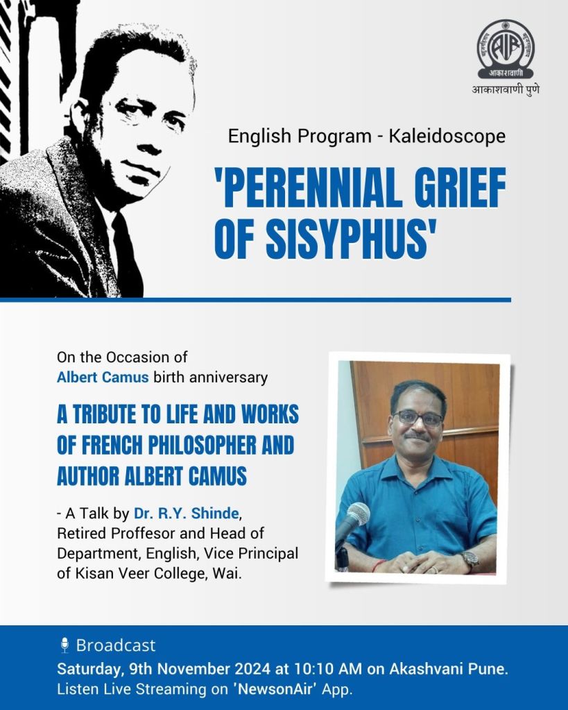 November 7 marked the death anniversary of Nobel Prize-winning French novelist and philosopher Albert Camus. On this occasion, Pune (India) Radio Station (All India Radio) paid tribute to him through their special English program, “Kaleidoscope.” For this, Mr. Gaurav Shimpi, the Program Officer of Pune Radio Station, invited Dr. R.Y. Shinde, a retired Head of the English Department, Vice Principal of Kisan Veer College (Wai, Dist. Satara), editor of an international journal, music critic, technology enthusiast, and an active blogger on WordPress under the name “veerites” (currently residing in Pune). The program was broadcast on Pune Radio Station on Saturday, November 9, at 10:10 a.m.