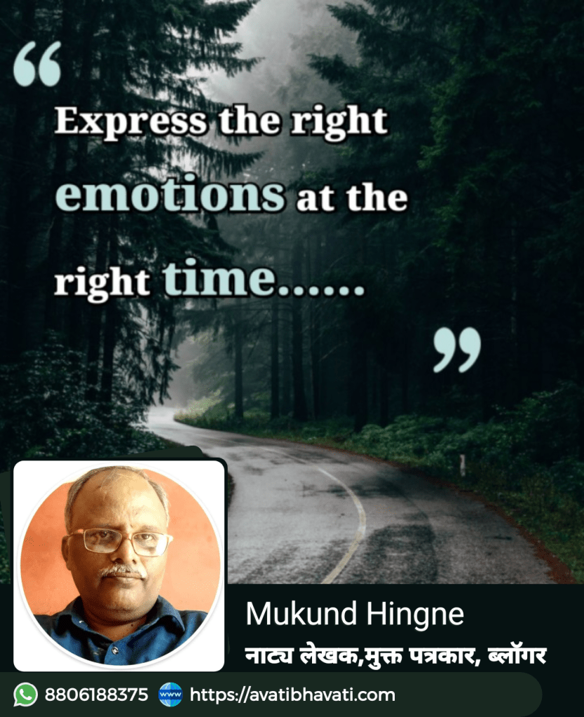 आपण आपल्या भावनांमध्ये किती वेळ आणि ऊर्जा खर्च करतो, हे आपल्या जीवनातील अनेक निर्णयांवर प्रभाव दर्शविते. भावनांमध्ये अडकून राहण्यापेक्षा त्या समजून घेवून पुढे जाणे अधिक महत्त्वाचे आहे. योग्य भावना, योग्य वेळी आणि योग्य प्रकारे व्यक्त करणाऱ्या माणसाचे जीवन अधिक समतोल आणि यशस्वी असते.