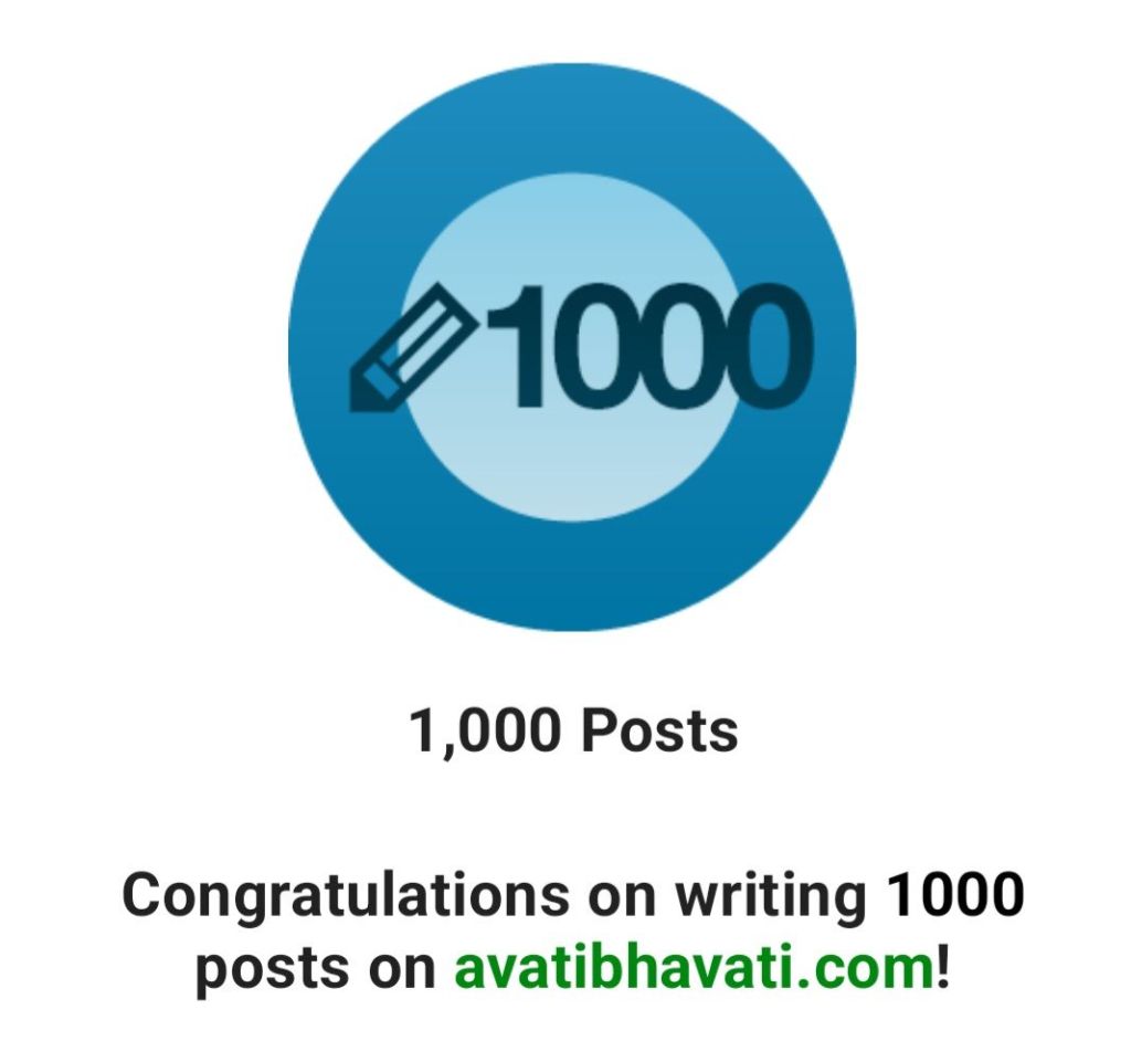 Today, I feel immense joy as I cross the milestone of one thousand posts on my blog avatibhavati.com. This has been possible only because of the encouragement from my subscribers, fellow bloggers, and followers. Please keep this love coming.